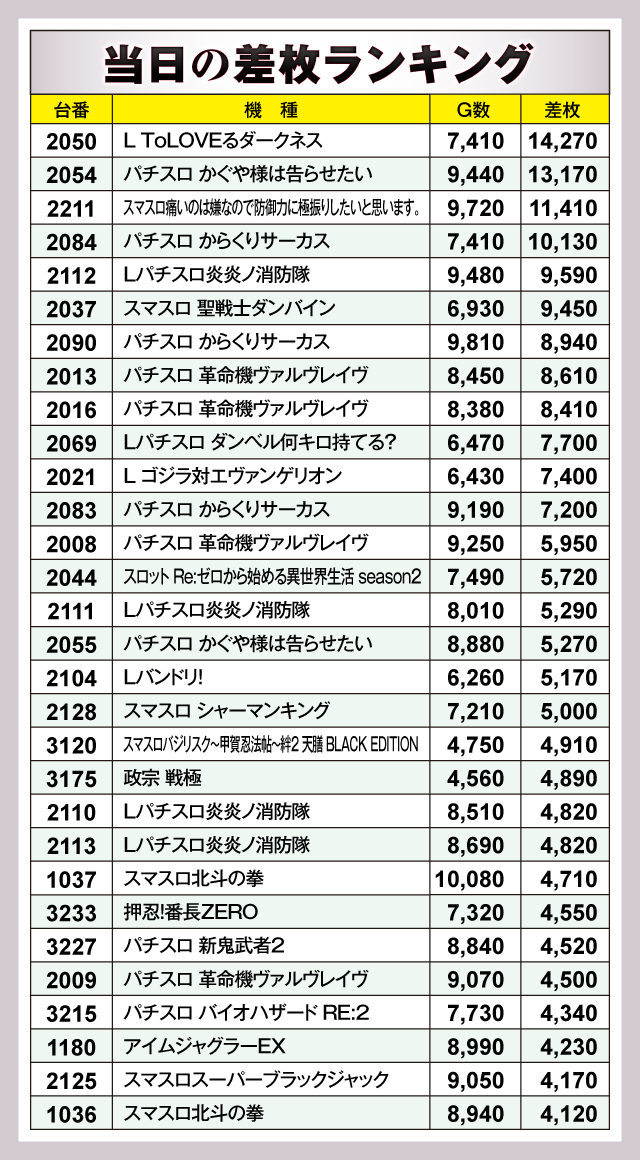 まずは当日の差枚ランキングをご紹介。トップ30台のすべてが差枚+4,000枚オーバーを記録し、さらに+7,000枚オーバーは12台出現。それらのなかでもっとも優秀だった台は、2050番台の『L ToLOVEるダークネス』で、差枚は+14,270枚を獲得! また、『パチスロ かぐや様は告らせたい』『スマスロ痛いのは嫌なので防御力に極振りしたいと思います。』『パチスロ からくりサーカス』でも万枚オーバーを記録するなど、各コーナーで大量の熱気を放っていた!