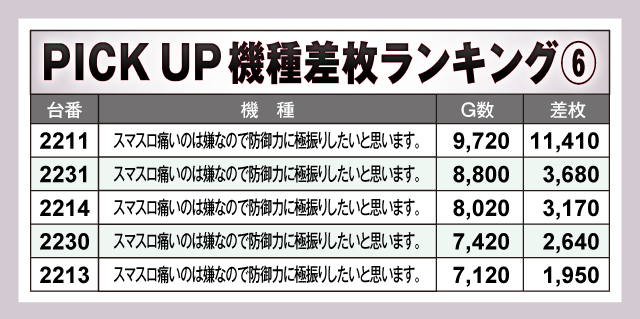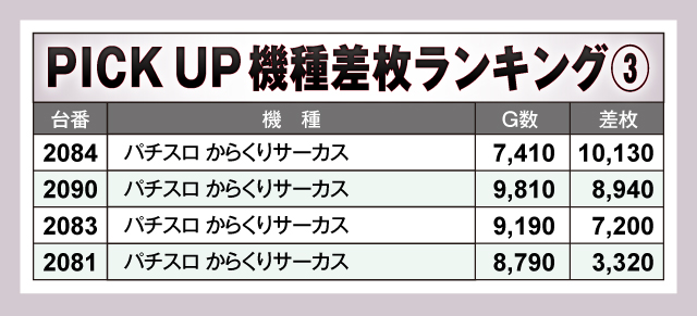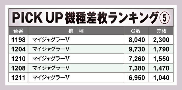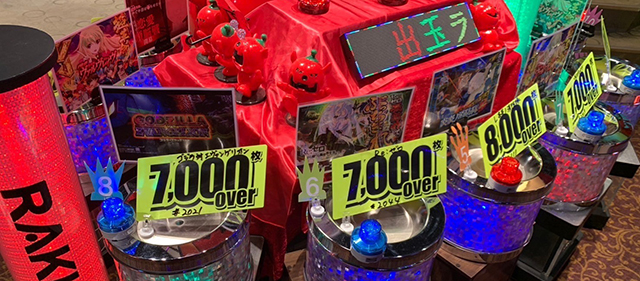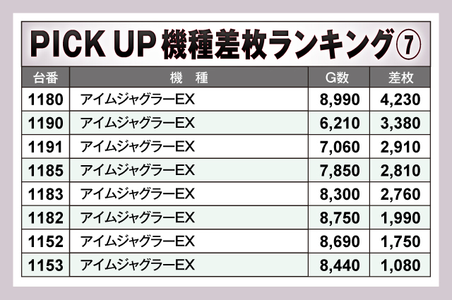 続いては、当日店内を大いに盛り上げた7機種をチェック。7機種それぞれから良台が出現しており、人気スマスロだけでなく定番の『ジャグラーシリーズ』でも見どころが満載! 『アイムジャグラーEX』では+4,000枚オーバーを記録するなど、終始大賑わいとなっていた。