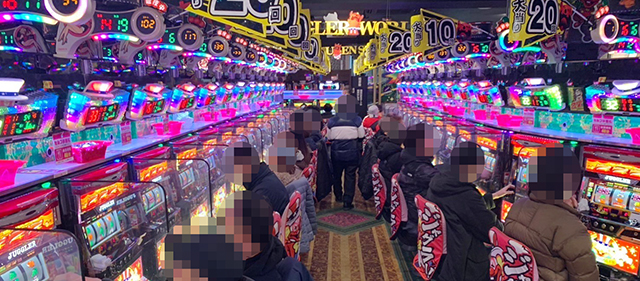 DMMぱちタウン取材班〝別班〟が威信を賭けて執り行う「VEPPAN」が、2月22日に「楽園蒲田店」にて実施された。本取材初実施となる同ホールには、朝から521人のファンが集まり開店前より大いなる熱気が渦巻いていた。オープン後のホール内の盛り上がりも目を見張るものがあり、パチスロコーナーのアチコチで良台を多数確認。果たしてどれほどの盛り上がりを見せてくれたのか!? ここからはパチスロ全567台の詳細とともに、当日の盛り上がりをチェックしていこう!