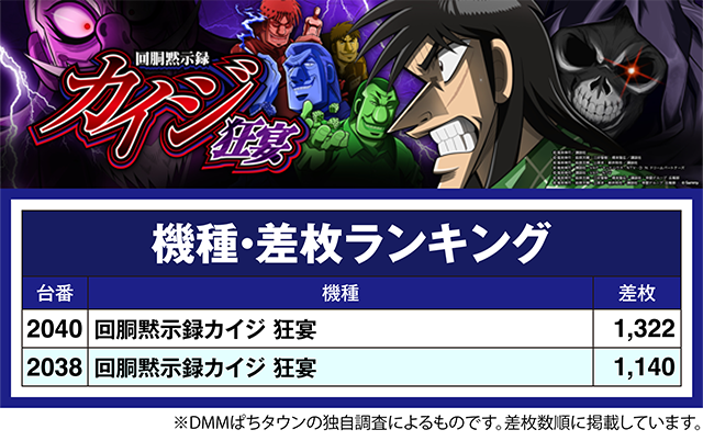 「回胴黙示録カイジ 狂宴」も2台が1,100pt以上と盛り上がりをみせた。