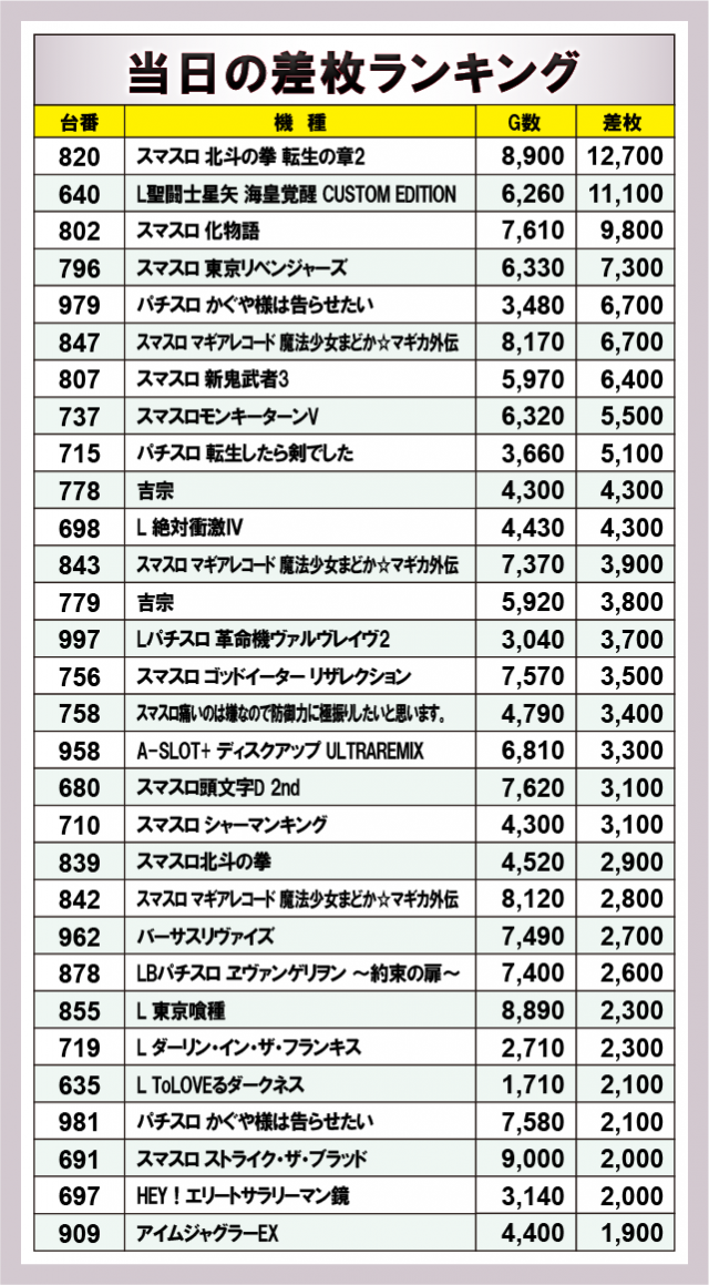 ※差枚数順に掲載しています