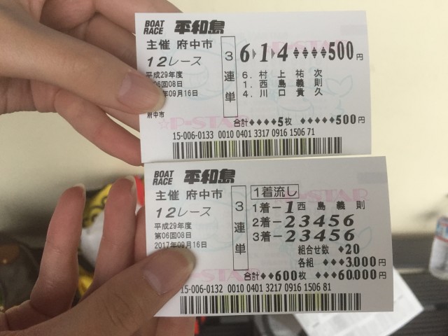きっとこの予想にのっかっておけば、的中するに違いないという予感はしたんですが、企画のことを考えるとそろそろ当てておきたい。それに、軍資金がたくさんあるときにしか広く買うことができないですし……。結局、リスクヘッジを考えて「1-全―全」の20点に3000円ずつベットすることにしました。残りの500円は夢を買うつもりで、「 6 -1- 4 」の舟券を購入しました。