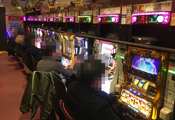 にぎわいは5円パチスロにも広がっており、笑顔のプレイヤーが多数。