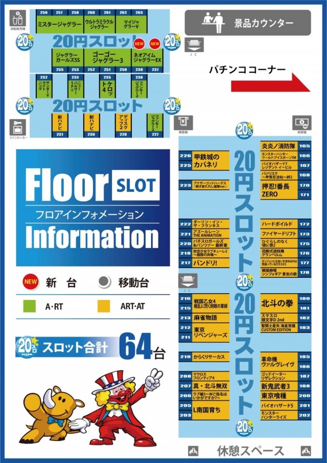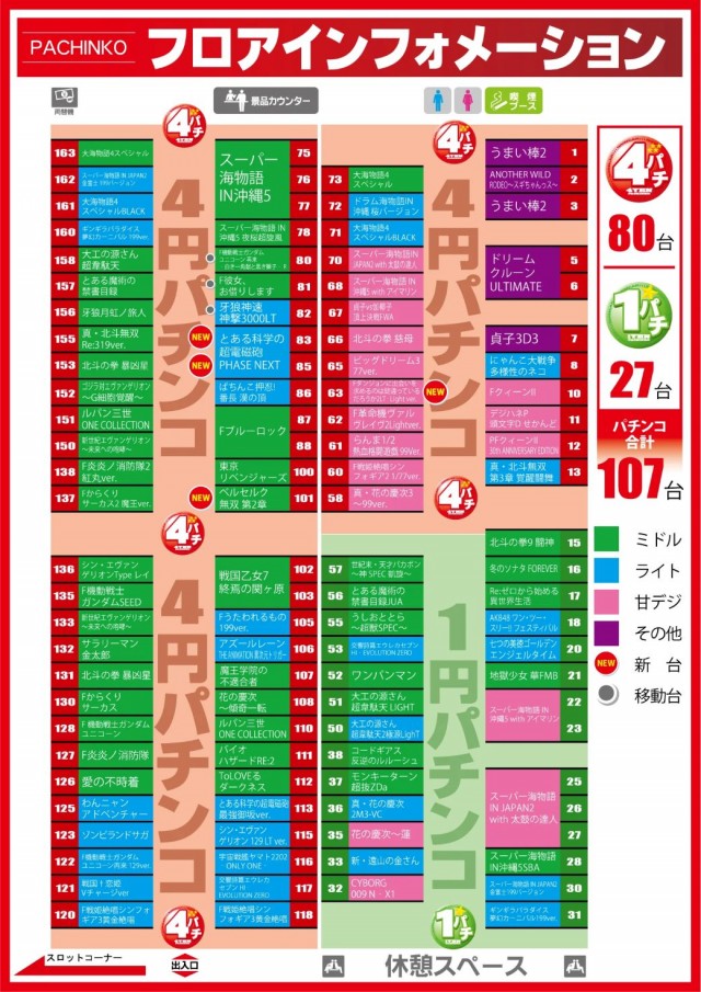 4パチ:80台 1パチ:27台 20スロ:64台 |