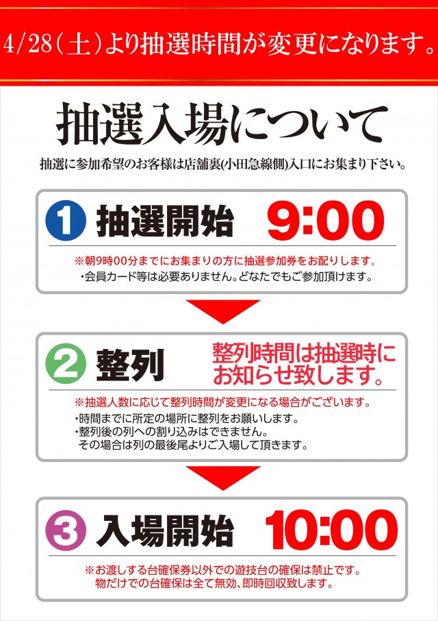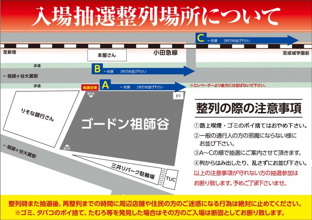 朝9:30までにお集まり頂いたお客様ならどなたでも参加可能。小田急線側の入口にて抽選を行います。ルールとマナーをお守りのうえご参加下さい。 |