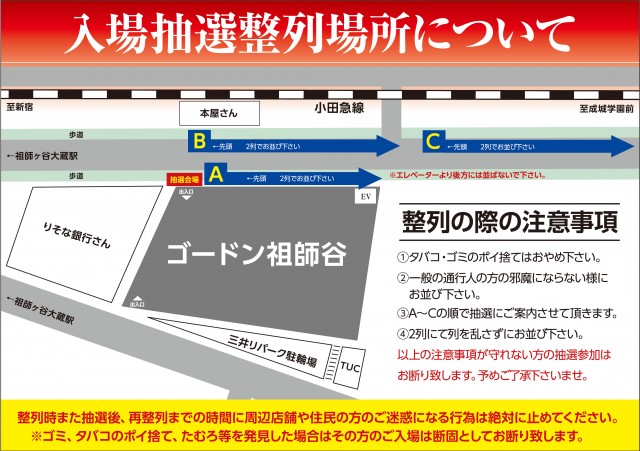 朝9:30までにお集まり頂いたお客様ならどなたでも参加可能。小田急線側の入口にて抽選を行います。ルールとマナーをお守りのうえご参加下さい。 |