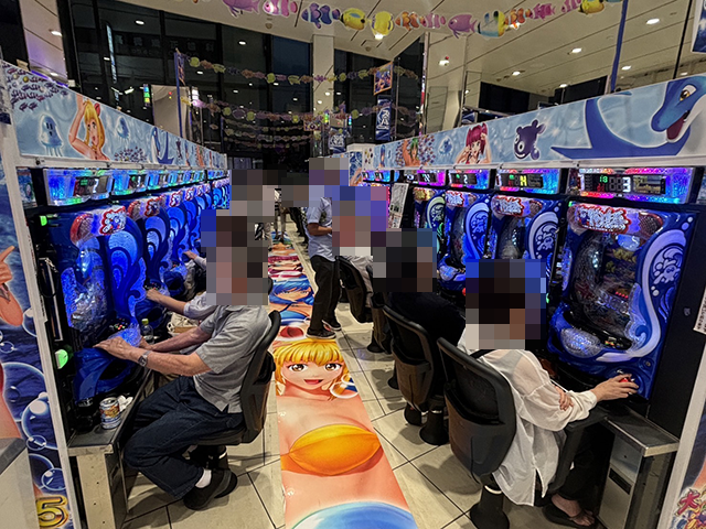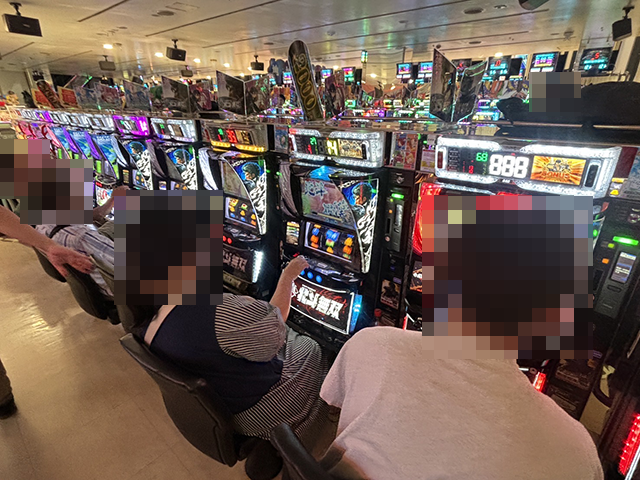 多くのプレイヤーでにぎわうジャグラーシリーズをはじめ、さまざまな機種に華やかな光景が広がっていた。