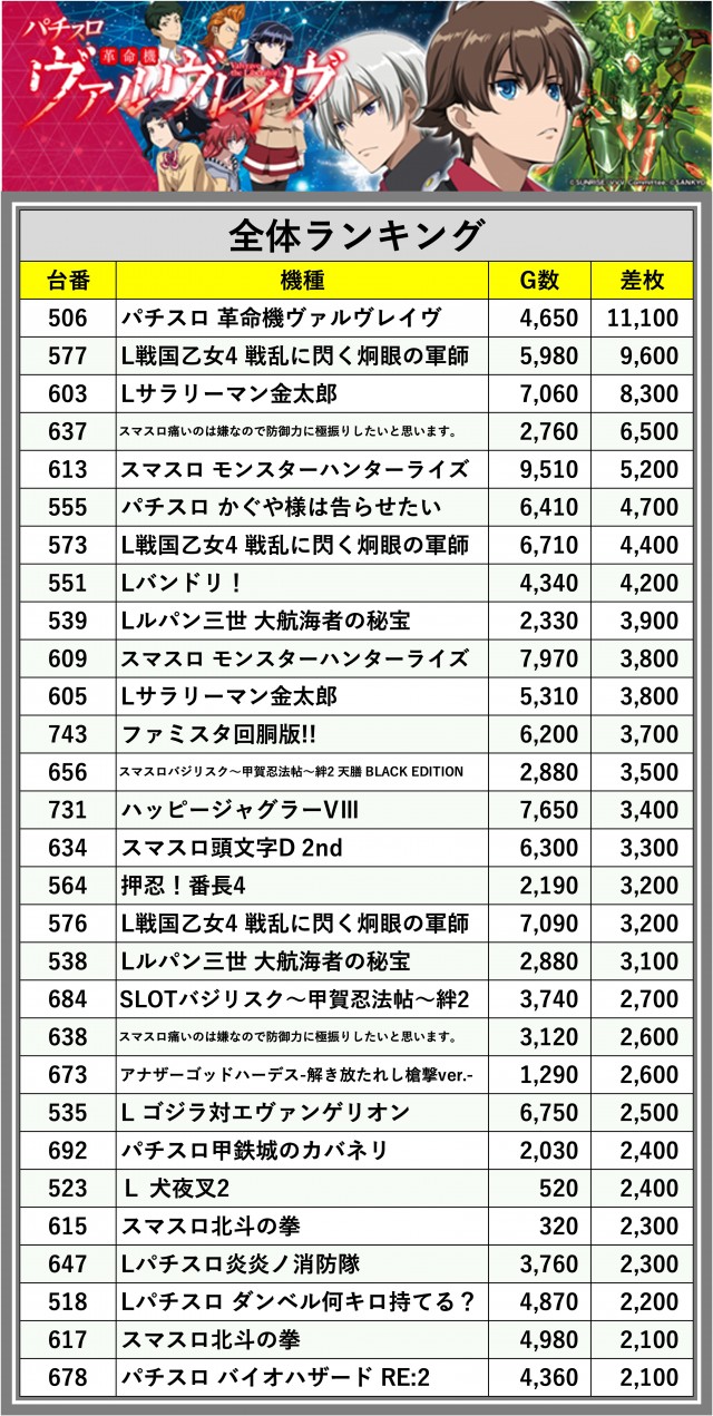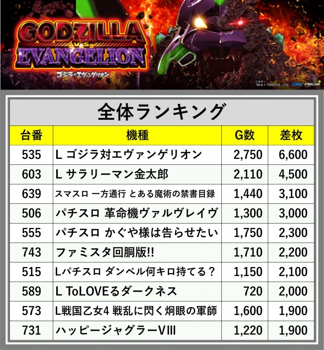 厳選された取材対象機種をはじめ、その他スロット全体から好記録が飛び出した!プレイヤーが楽しんだ1日を下記データにて振り返ってみて欲しい。