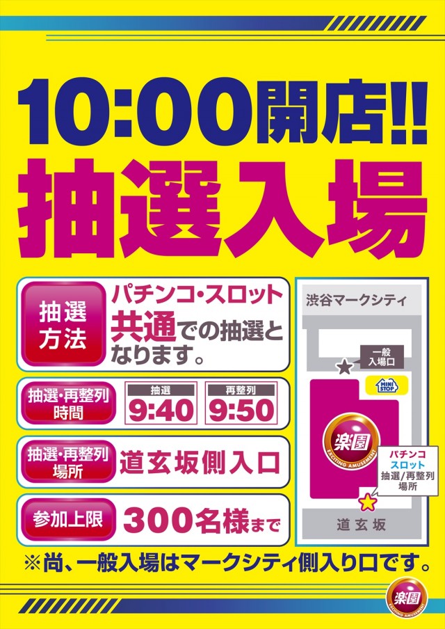 抽選は道玄坂側 正面口にて毎日9:40までにお並び頂いたお客様対象として抽選を行ないます。 |