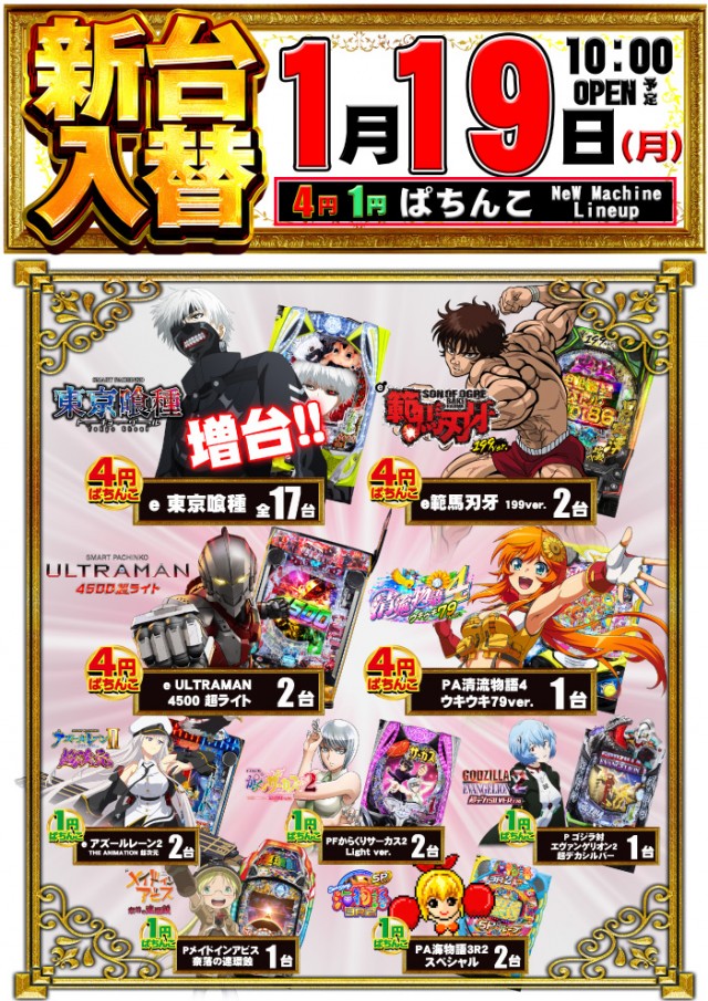 🌈1/19 新台入替 スロット抽選9:30 パチンコ並び順🌈