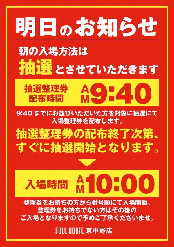 通常10時入場開始となります。9:40より並び順で入場番号抽選を行います。抽選配布終了次第すぐに再整列させて頂きます。(会員カード不要) |