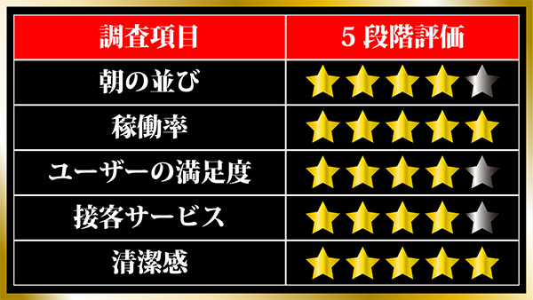 台周りはもちろん、通路やトイレの隅々まで清掃が行き届いた店内は居心地も抜群。丁寧に対応するスタッフの姿もあり、遊技に集中できる環境もしっかりと整っていた。