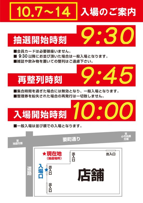 店舗脇の駐輪場にてAM9:45より抽選を行います。 |