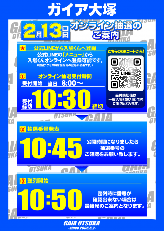 お並び順の入場ではございません。入場順番決めはLINEメニュー内の入場くんオンラインより当日朝8:00~9:30までに参加をお願い致します。顔写真の認証が必要となりますので、事前の登録をお願い致します。 |