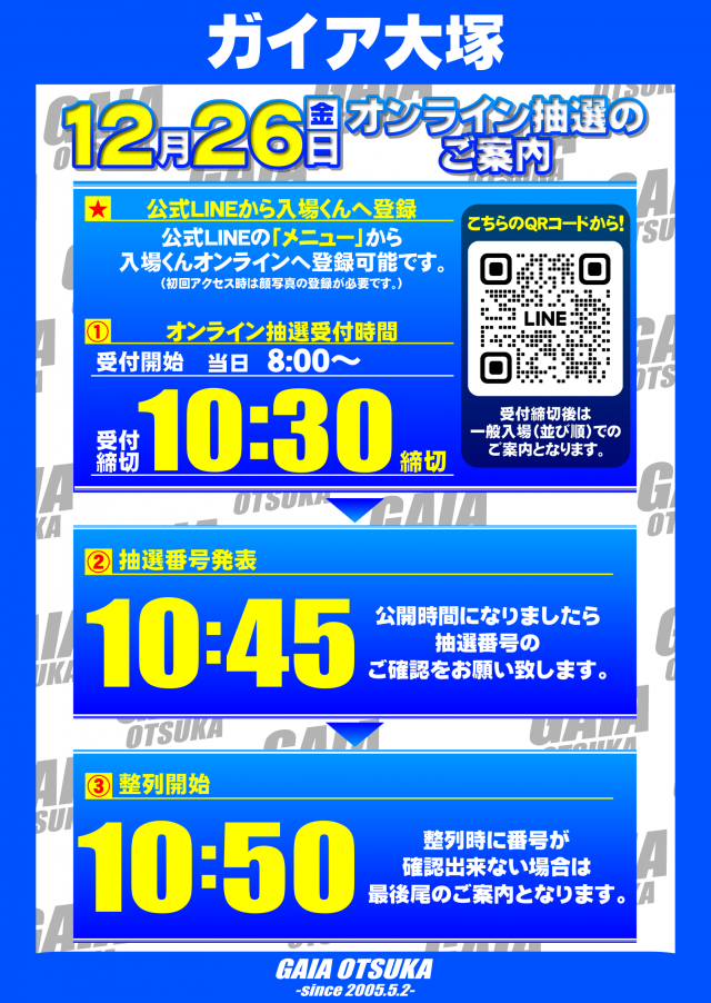 お並び順の入場ではございません。入場順番決めはLINEメニュー内の入場くんオンラインより当日朝8:00~9:30までに参加をお願い致します。顔写真の認証が必要となりますので、事前の登録をお願い致します。 |