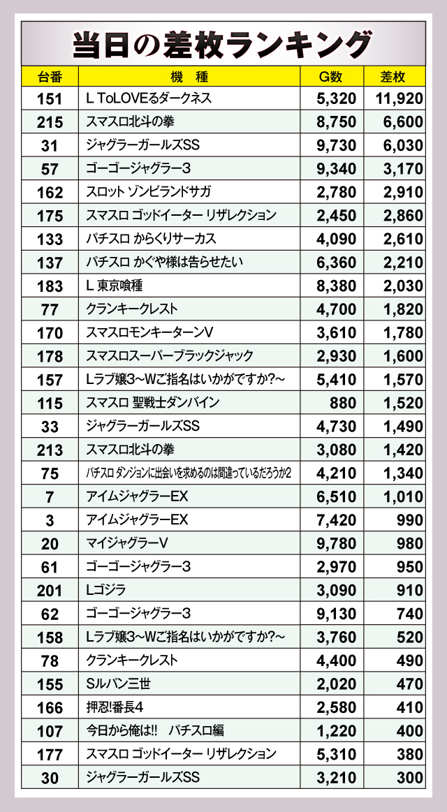 まずは差枚ランキングのチェックから。全30台のうち18台が差枚+1,000枚オーバーで、+2,000枚オーバーは9台出現。それらのなかでもっとも優秀だった台は、151番台の「L ToLOVEるダークネス」で、差枚は+11,920枚を獲得! またランクイン機種を見渡すと、「スマスロ ゴッドイーター リザレクション」などの人気のスマスロを含め、ジャグラーシリーズも数多くがランクイン。店内全体にチャンスは存在していたようだ!