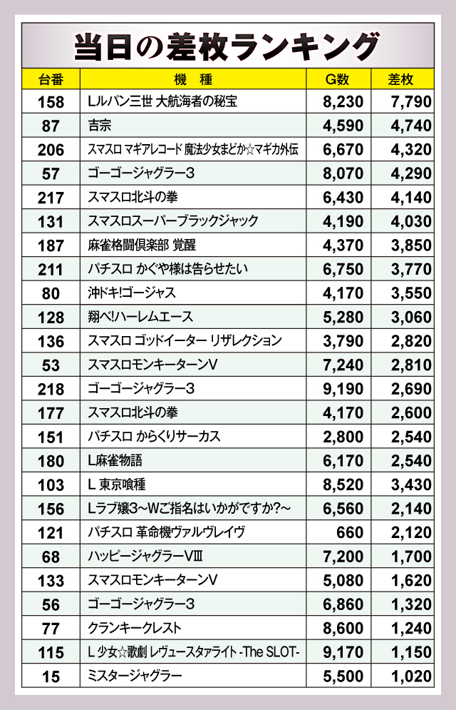 当日の店内状況を差枚ランキングから振り返ると、「Lルパン三世 大航海者の秘宝」が+7,790枚という圧巻の記録で頂点に立った。さらに「吉宗」「スマスロ マギアレコード 魔法少女まどか☆マギカ外伝」「ゴーゴージャグラー3」など、6機種が+4,000枚の壁を突破。スマスロからジャグラーシリーズまで、多種多様なマシンが輝きを放ち、店内全体がチャンスに満ちていたことを証明した。