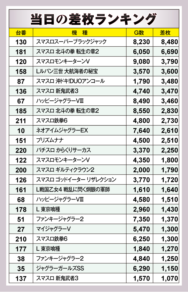 ※差枚数順に掲載しています。