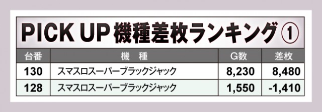 続いて、特に盛り上がっていた機種をピックアップしていく。ランキングトップの「スマスロスーパーブラックジャック」は、130番台が8,230Gも回されており、出玉・回転数ともに文句ナシの結果だった。また「スマスロ 新鬼武者3」も好調で、136番台が+3,470枚、137番台が+1,070枚と、複数台がプラスになっていたのが印象的だ。他にも「ハッピージャグラーVⅢ」などのノーマル機もしっかりと遊ばれており、店内のいろんな場所にチャンスがあったようだ。