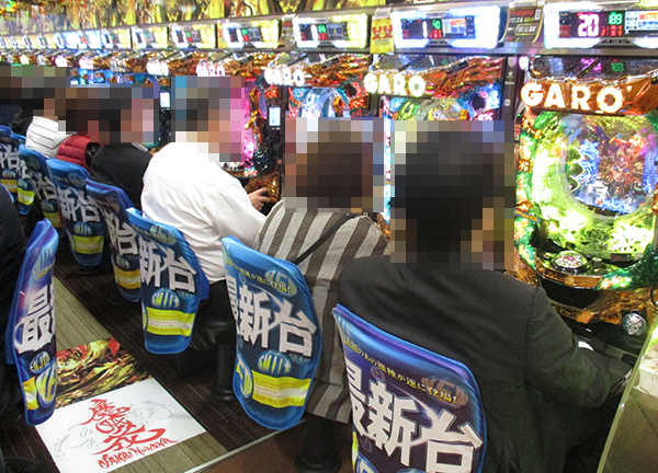 ホール内の様子をみてみると、4円パチンコでは新台の「CR牙狼 魔戒ノ花」が満席状態。機種の特徴の1つでもある高い瞬発力を活かしているような多数のプレイヤーもいるなど、シマ全体から大きな活気を感じられた。