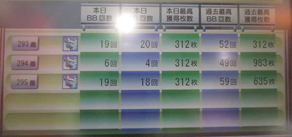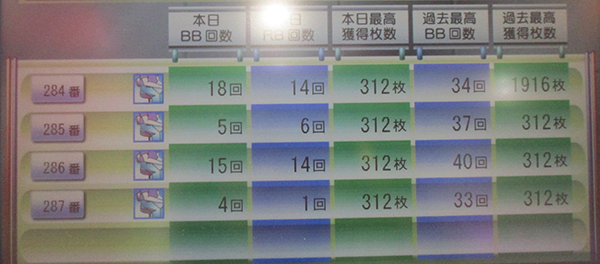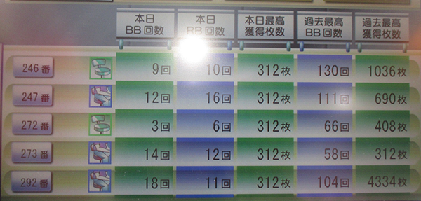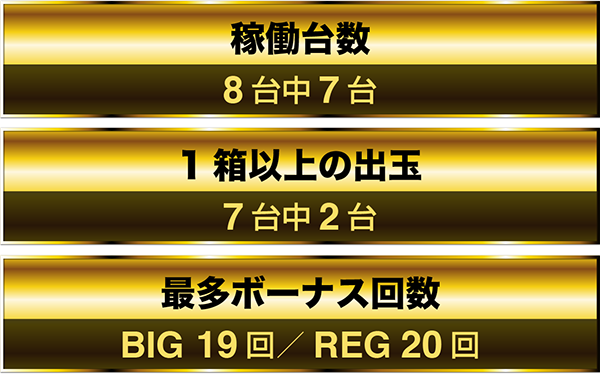 ボーナス回数が一桁の台もあったが、フル稼働となっていただけに、時間が経過したときにはまた違った光景をみられたのかもしれない。