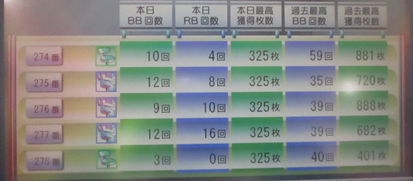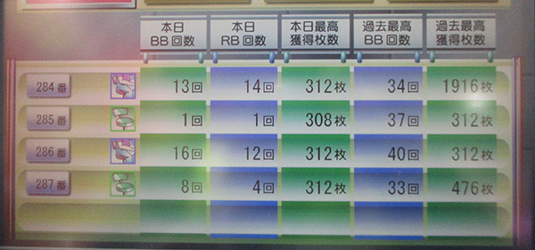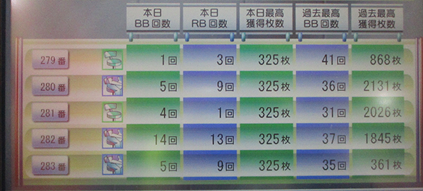 最終的には15台中9台がプラス差枚を記録しており、トータルでは9000ptを上回っていた。