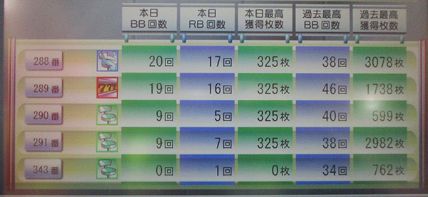 データカウンターに目をうつすと、2台がボーナス回数20回オーバー。