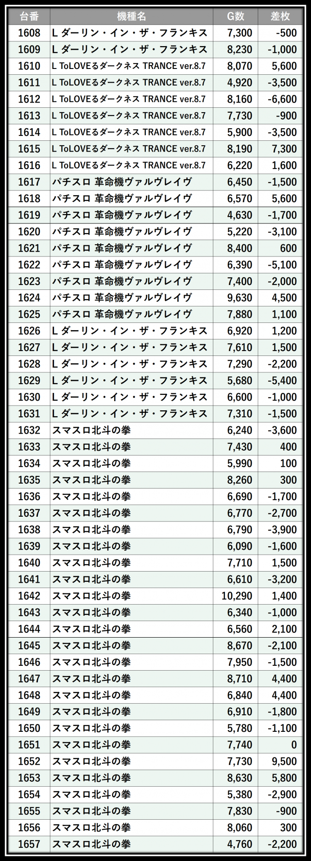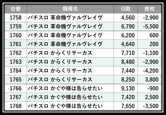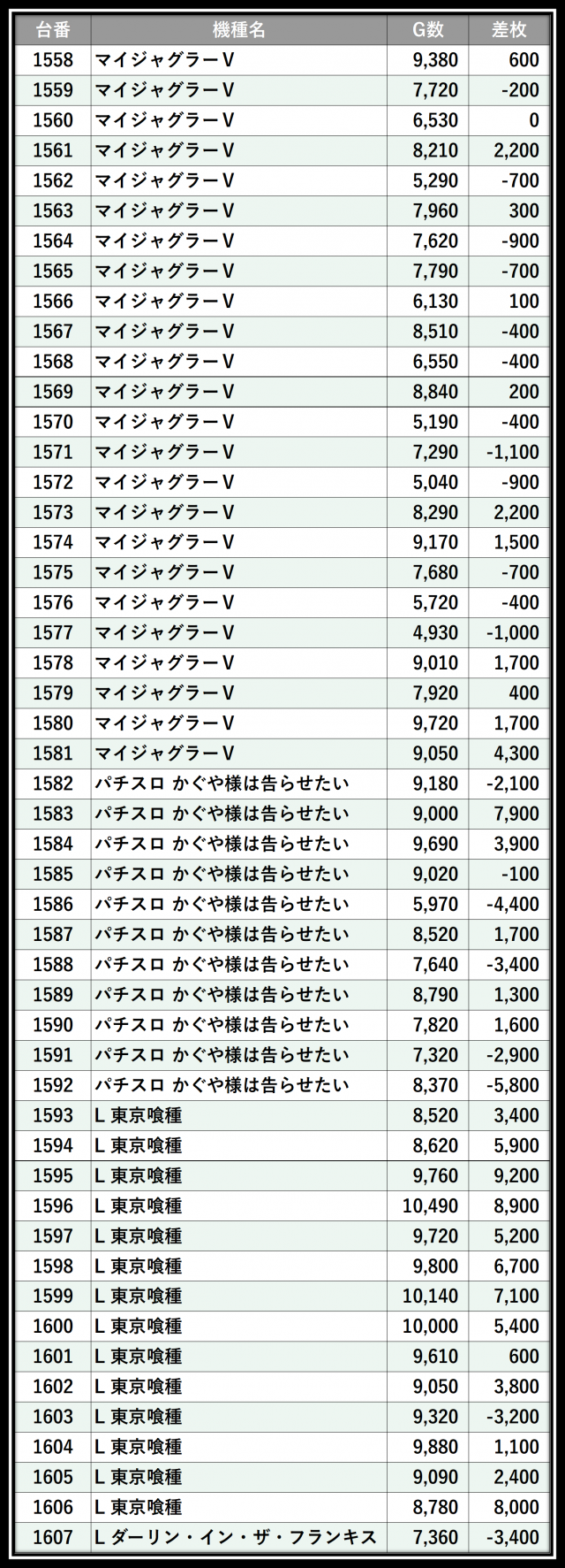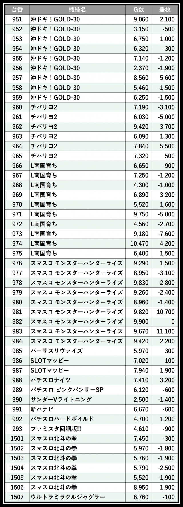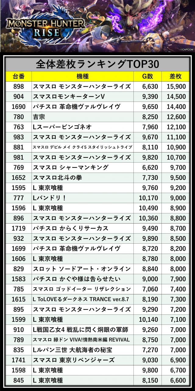 ※差枚数順に掲載しています