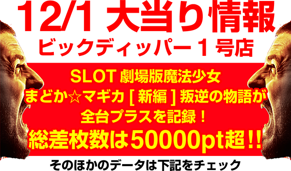 12月1日の「ビックディッパ―新橋1号店」で、目立っていたのは『SLOT魔法少女まどか☆マギカ2』と『SLOT劇場版魔法少女まどか☆マギカ[新編]叛逆の物語』。