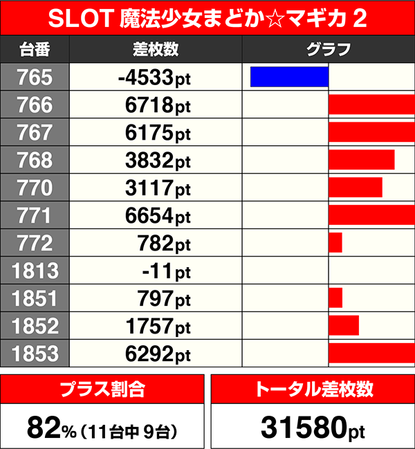 『SLOT魔法少女まどか☆マギカ2』は11台中9台がプラスで、トータル差枚数は30000pt以上。