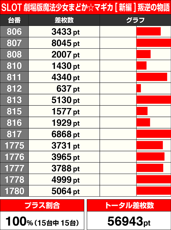 『SLOT劇場版魔法少女まどか☆マギカ[新編]叛逆の物語』は全台がプラスで、トータル差枚数は56943ptを記録した。