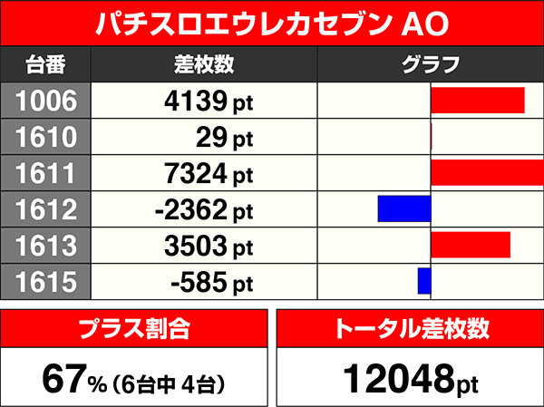 『パチスロエウレカセブンAO』はプラスを記録した4台のうち、3台が3500ptを上回る好記録。