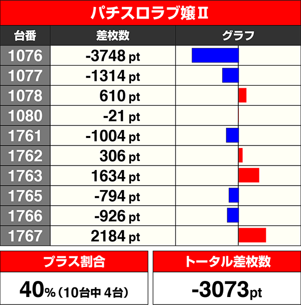 『パチスロラブ嬢Ⅱ』も4台がプラスで、1台は2000ptを上回った。