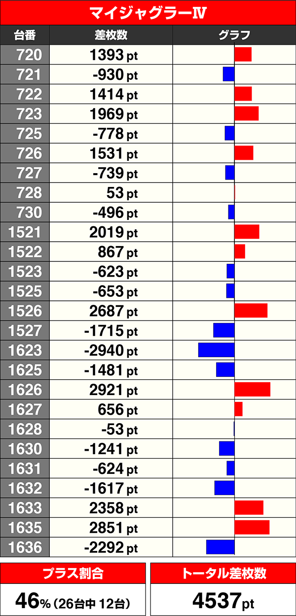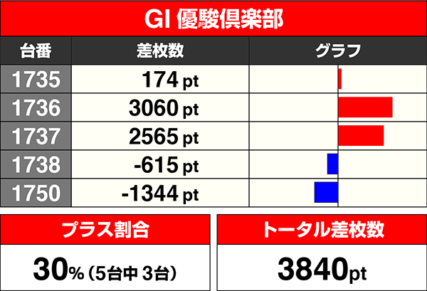 プラスを記録した台の6割以上がプラス1000ptを上回り、メリハリのあるデータとなった。