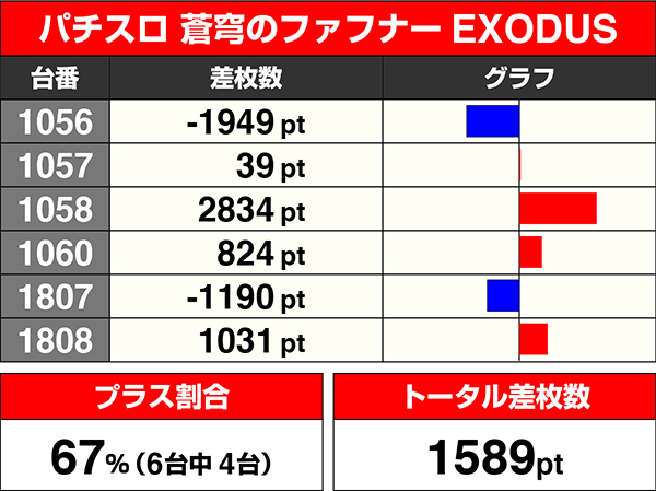 『GI優駿倶楽部』と『パチスロ 蒼穹のファフナーEXODUS』はともにプラス台数割合50%超。