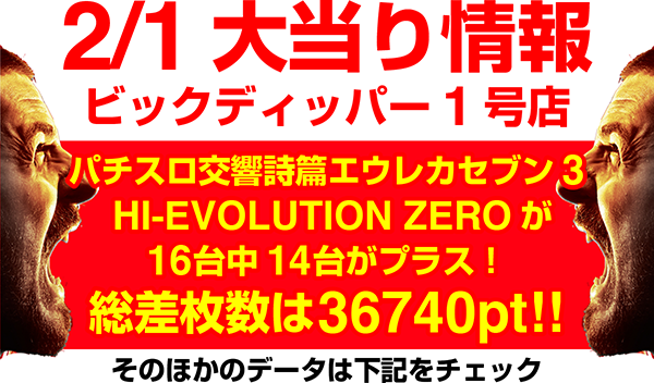 2月1日の「ビックディッパ―新橋1号店」で、とくに目立ったのは『パチスロ交響詩篇エウレカセブン3 HI-EVOLUTION ZERO』と『パチスロエウレカセブンAO』。