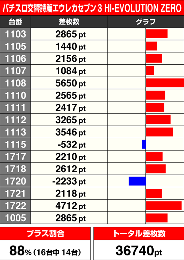 『パチスロ交響詩篇エウレカセブン3 HI-EVOLUTION ZERO』は14台がプラスでトータル差枚数は36740pt。