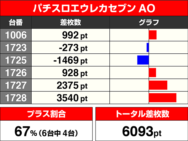 『パチスロエウレカセブンAO』も設置台数の半数を超える6台中4台がプラスであった。