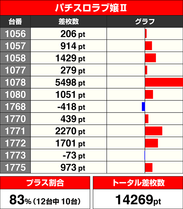 『パチスロラブ嬢Ⅱ』は12台中10台がプラスで、全体的にまんべんなく盛り上がっている印象。