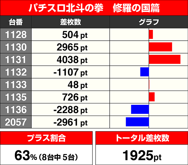 『パチスロ北斗の拳 修羅の国篇』は半数以上がプラスを記録し、4000ptを超える台もあった。