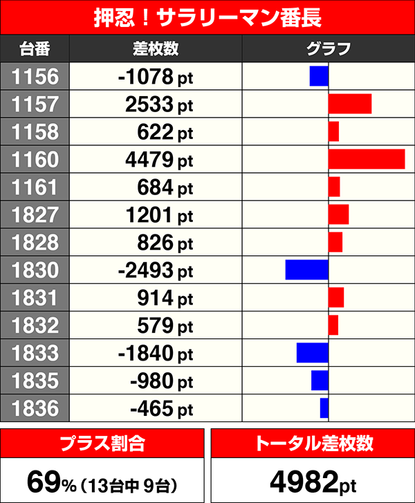 『押忍!サラリーマン番長』は13台中9台がプラスで、トータル差枚数は4982pt。