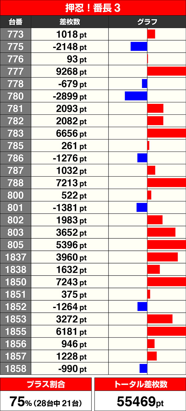 『押忍!番長3』は9台が3000ptオーバーを記録し、トータルの差枚数は55000ptを上回った。