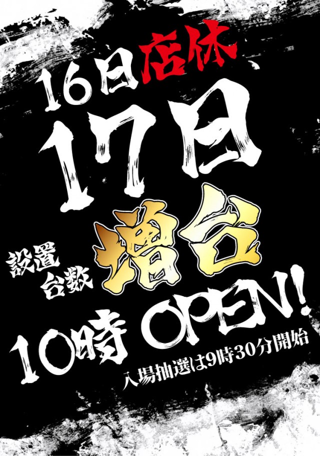 毎日9時30分より抽選入場、新装開店は9時50分再整列時に番号順に新台整理券配布 |