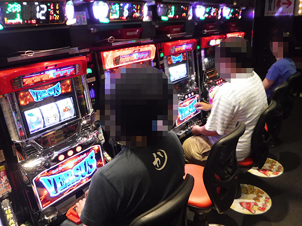 「バーサス」や「ハナビ」、「ハイパーリノ」なども人気。プレイヤーたちはそれぞれ好みの機種でシンプルな告知演出の魅力を味わっていた。
