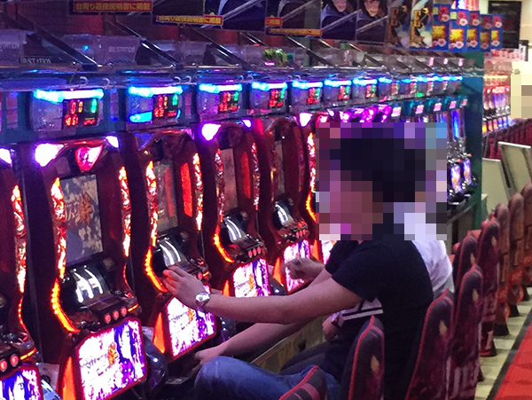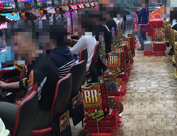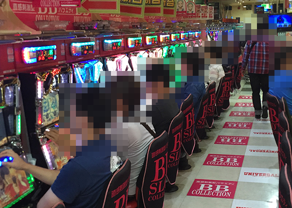 午後のパチスロでは、朝イチから注目を集めていた「バジリスク~甲賀忍法帖~絆」が盛況。機種の性能を最大限まで引き出しているといったプレイヤーが多く、華やかな光景が広がっていた。