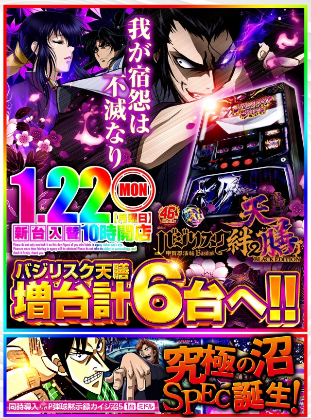 1月22日(月)新台入替10時開店🌈バジリスク絆2天膳増台🌈