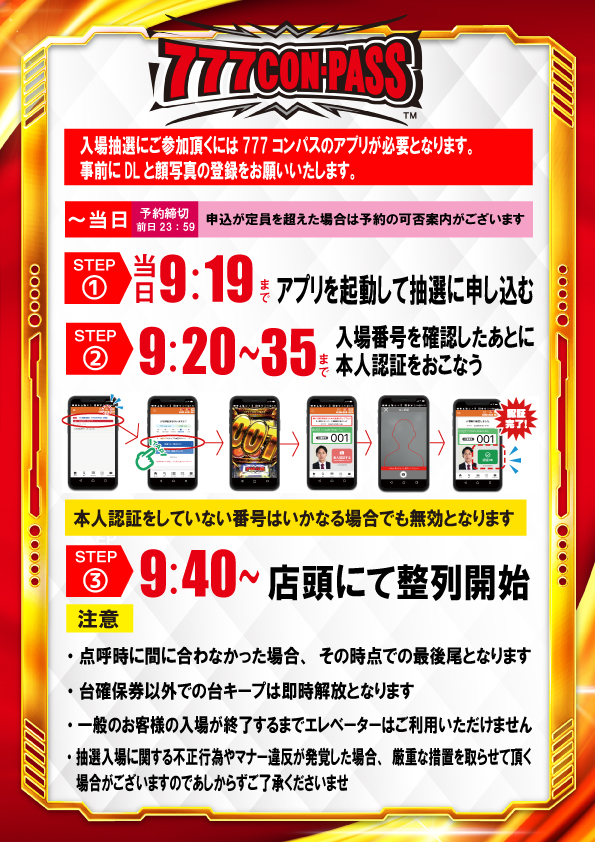 抽選は777CON-PASSで行います。当日の整列は店頭にて9時45分から開始します。抽選画面を準備した状態で時間までにお集まりください。 |