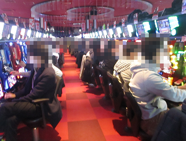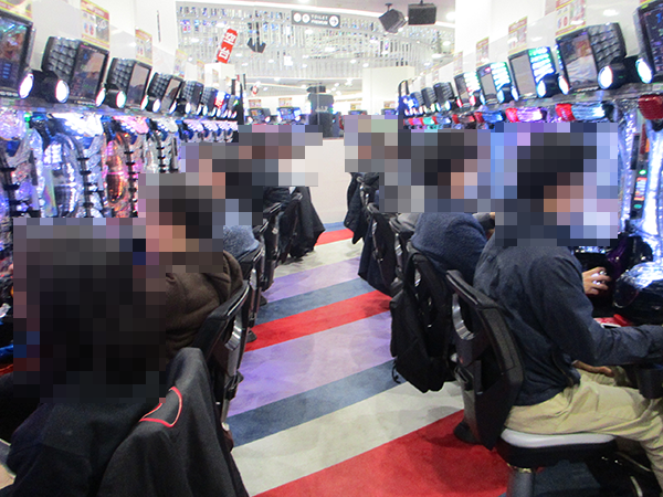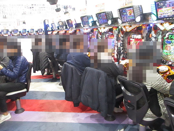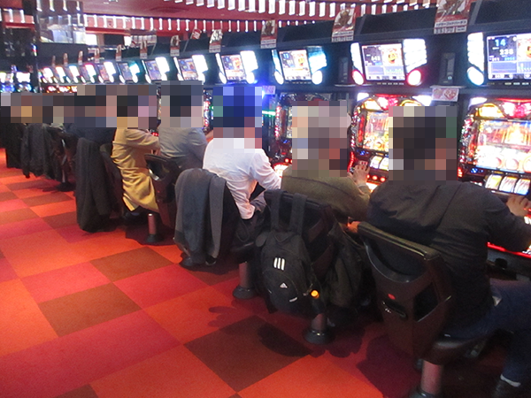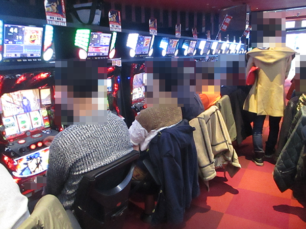 朝イチのパチスロをみると、「バジリスク~甲賀忍法帖~絆」や「SLOT魔法少女まどか☆マギカ」など、すべての機種がほぼ満席といった状況。