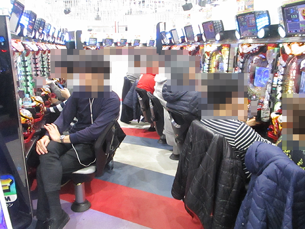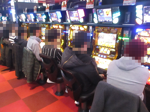 朝イチのパチスロにおいては、「押忍!番長3」やジャグラーシリーズなど、AT・ART機やボーナスタイプを問わずにさまざまな機種が満席。