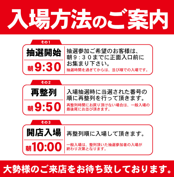 朝9:30までにお並び頂いたお客様を対象に抽選を致します。 |
